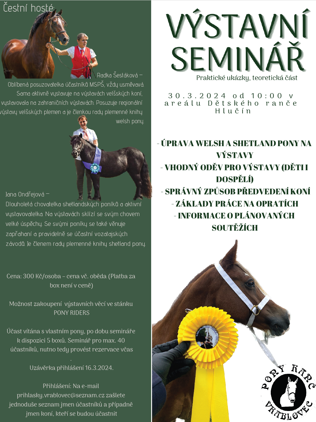 Chystáte se letos na výstavu se svým velšským, shetlandským nebo případně i bezplemenným poníkem? Pak je tento seminář právě pro Vás! Připravili jsme pro Vás praktický, a samozřejmě také částečně teoretický, seminář zaměřený na správnou úpravu poníka a také vystavovatele, ať už se jedná o dítě či dospělého! Náš výstavní seminář se bude konat 30.3.2024 od 10:00 v areálu Dětský ranč Hlučín Součástí semináře bude také ukázka práce s poníkem na opratích.